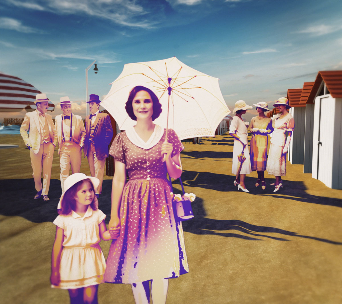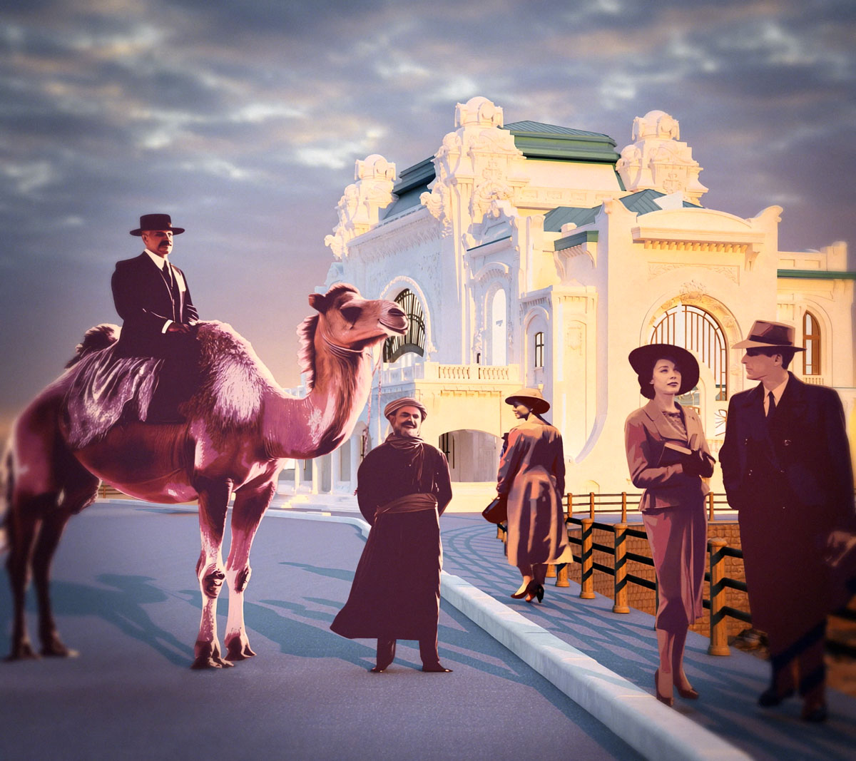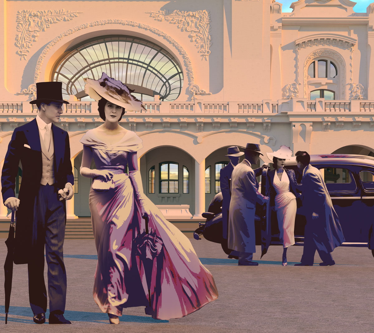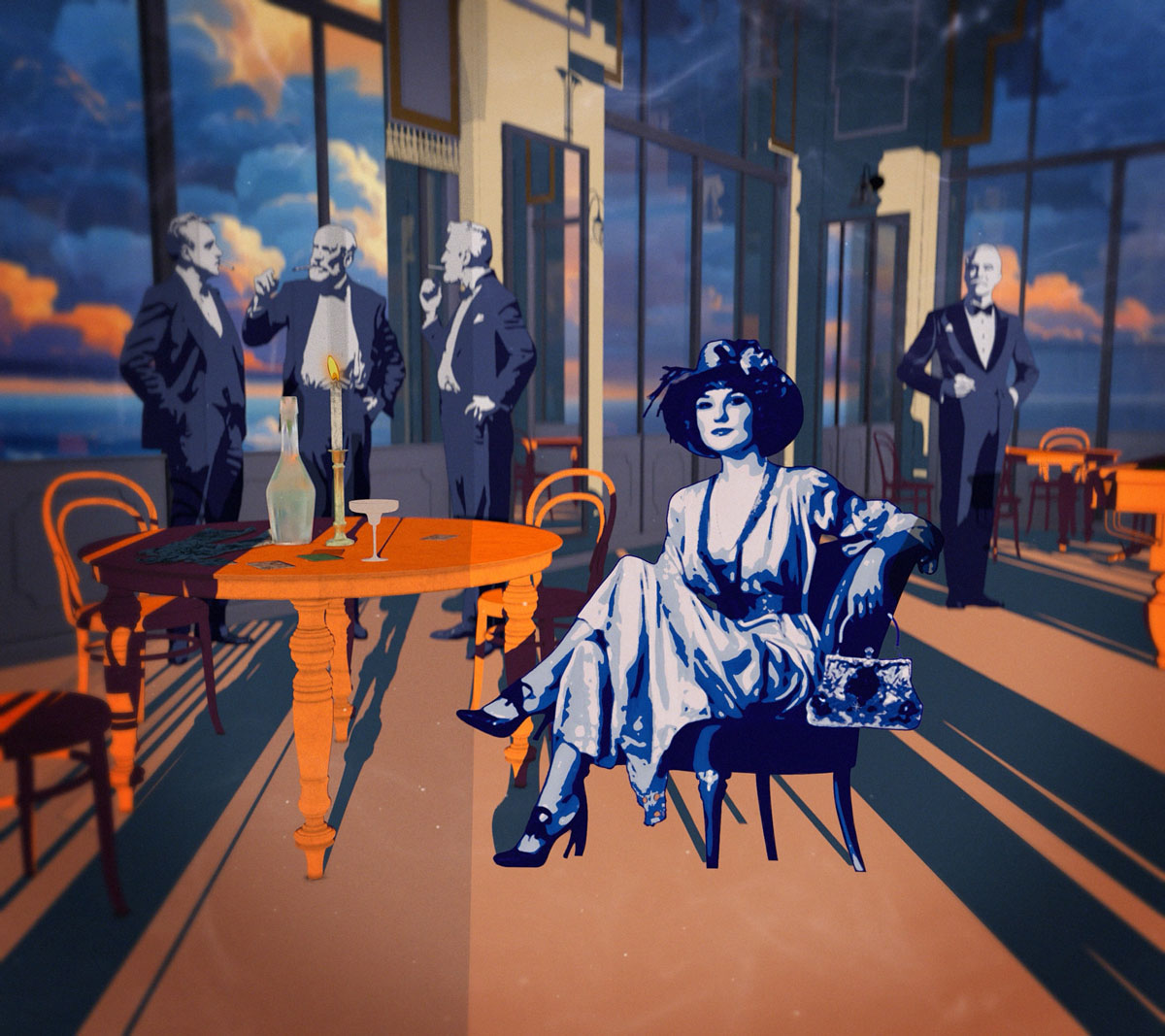 Drawing on extensive research of archival photographs, historical texts, and a detailed 3D reconstruction of the building—both exterior and interior—we created eight evocative scenes illustrating defining moments of the era: board games, rolling waves, elegant promenades, lively nightlife, and other emblematic experiences of the period.