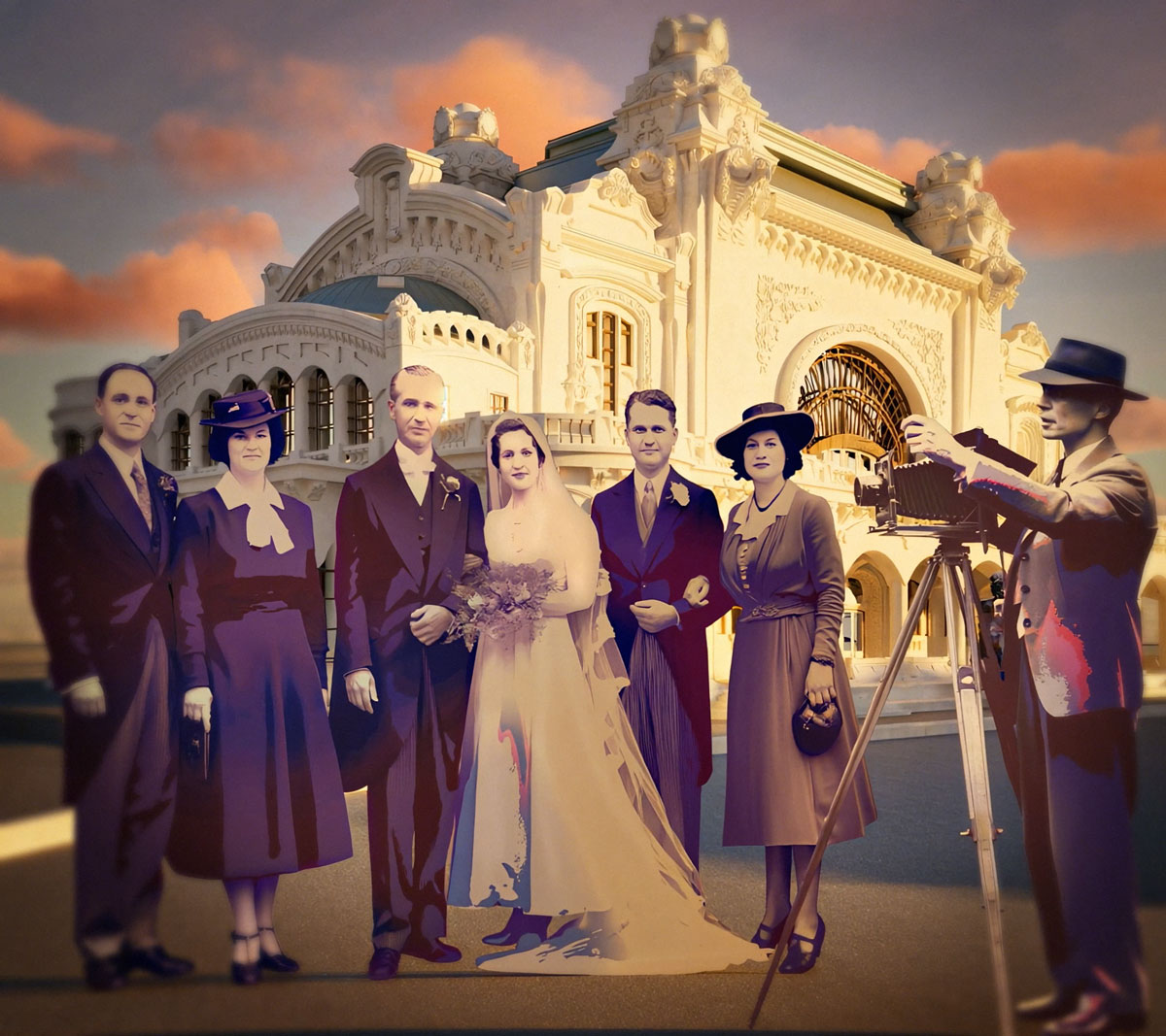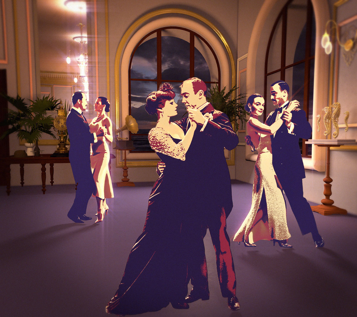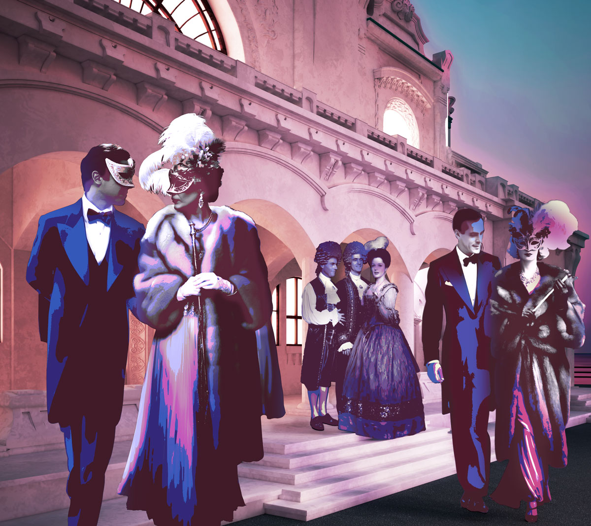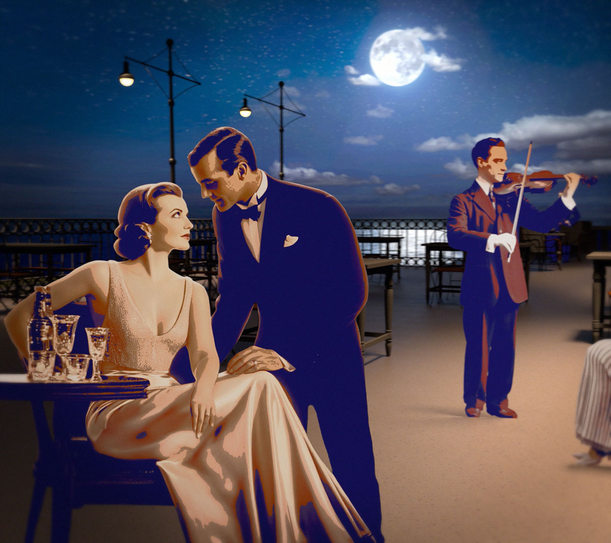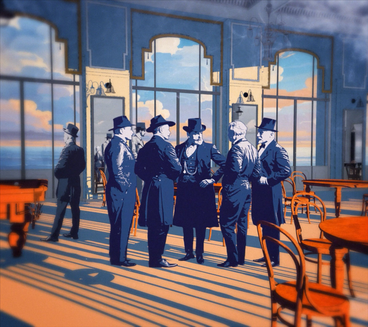 Drawing on extensive research of archival photographs, historical texts, and a detailed 3D reconstruction of the building—both exterior and interior—we created eight evocative scenes illustrating defining moments of the era: board games, rolling waves, elegant promenades, lively nightlife, and other emblematic experiences of the period.